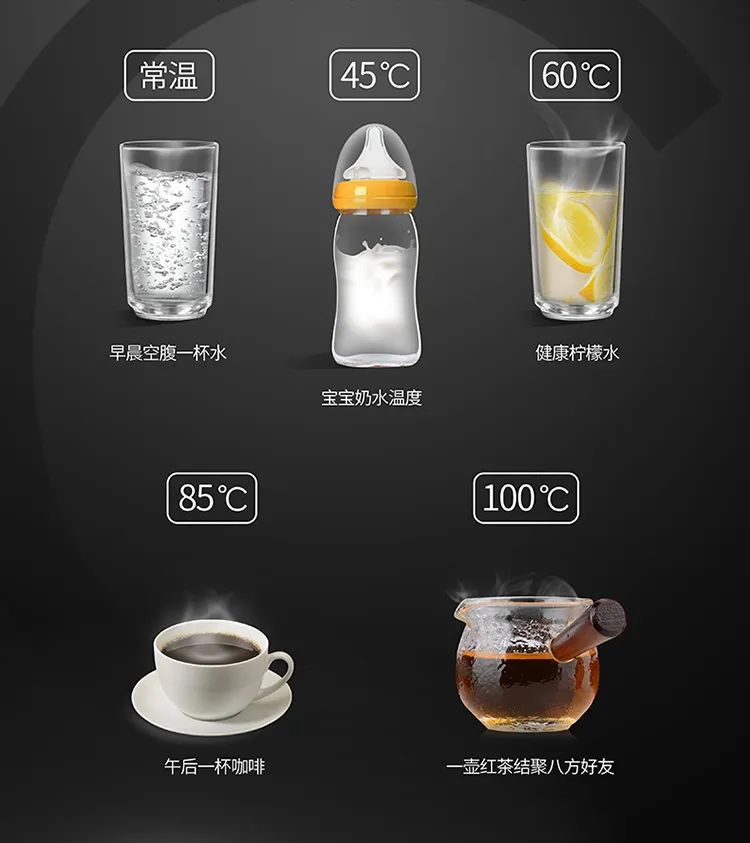 从常温到100℃,几乎满足你生活的所有需求。45℃,是留给宝宝的温度,半夜泡奶,再也不用手忙脚乱了,只需几键,轻松搞定。60℃,是爱美女生的最爱温度,早晨的蜂蜜水或是午后的柠檬茶,冲泡刚刚好。85℃,泡一杯香浓咖啡,开启活力满满的一天。偶尔晚上还在熬夜加班,就用100℃水温泡杯面,慰劳加班时饥饿的肠胃,精致生活,全部一机搞定。