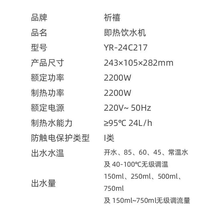 想要精致健康的饮水生活就从这台“即热饮水机 ”开始。祈禧即热饮水机(YR-24C217),满足你对精致健康饮水的需求,秒级速热、5档调温,4档定量出水,小巧便捷,高颜值,一款更懂你的智能饮水机。